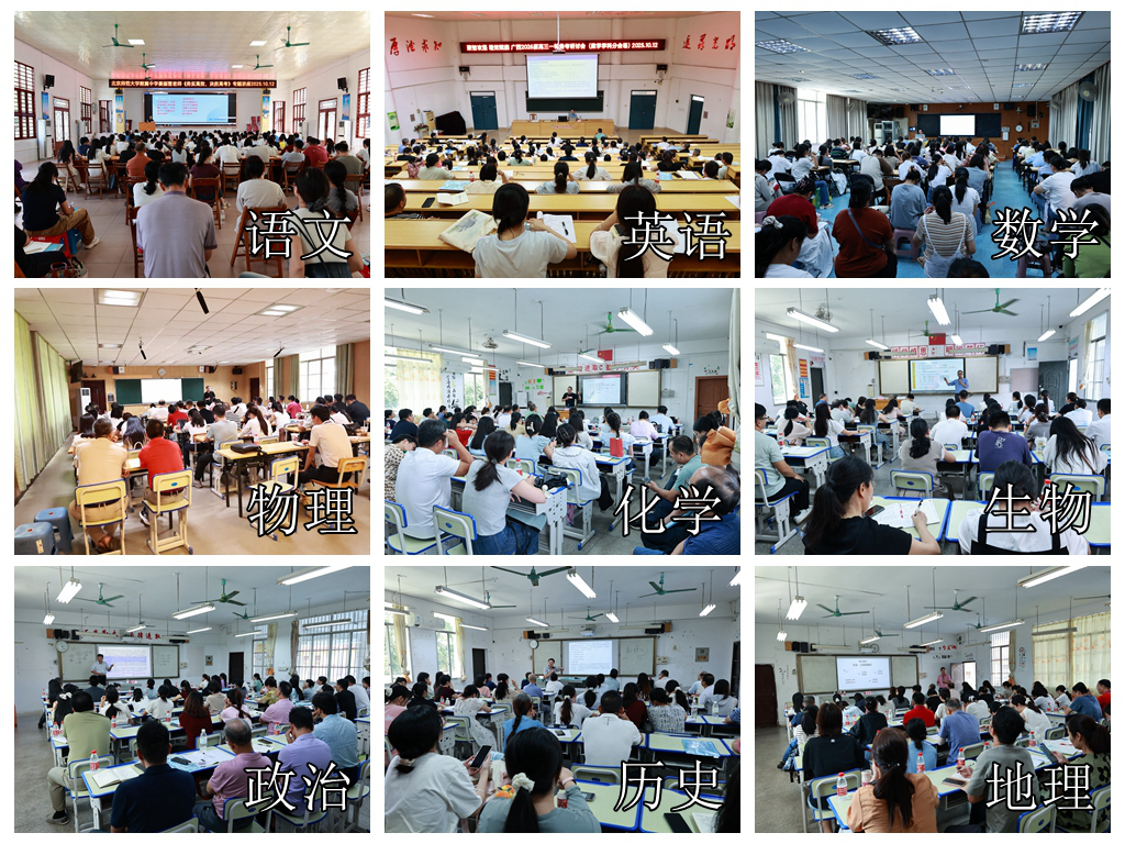 研讨会第二阶段,当天下午,语文、数学、英语、物理、化学、生物、政治、历史、地理九大学科备考讲座在武鸣高中灵水校区同步开展,九学科备考讲座分别邀请了北京师范大学附属中学、武汉市黄陂区第一中学、湖南师范大学附属中学、湖北省武汉市第三中学、湖北省襄阳市第四中学、河南省光山县第二高级中学、湖南省长沙市第一中学、湖南省长沙市雅礼中学等各地名校名师作专题分享。各学科围绕2026届高三一轮备考展开深度解读。各分会场气氛热烈,主讲嘉宾倾囊相授,参会教师认真聆听、积极记录,互动环节围绕复习难题深入探讨,教研氛围浓厚。