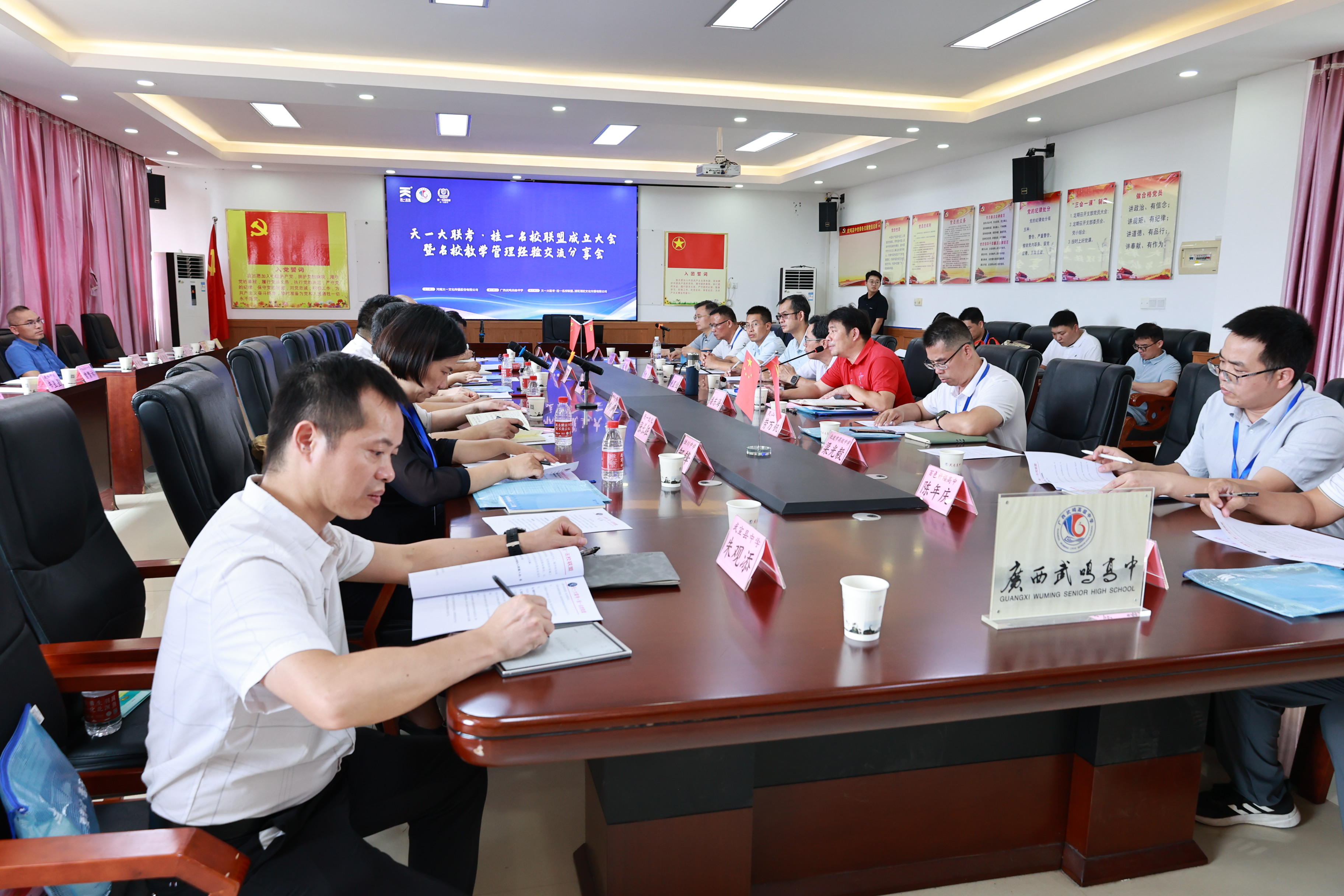 通过此次会议,天一大联考•桂一名校联盟正式成立,经全场参会代表表决,大会一致通过广西武鸣高级中学校长潘东海当选联盟理事长的决议,正式聘请潘校长为联盟理事长。百色祈福高中、北流市高级中学、宾阳中学、博白中学、扶绥中学、灌阳县高级中学、贵州荔波高级中学、来宾高级中学、灵山中学、陆川中学、马山中学、平南中学、武鸣高级中学(注:排名不分先后,学校按校名首字拼音排序,首字字母相同按次字拼音排序)成为首批理事单位。各理事单位之间统一思想,对联盟在后续的工作达成共识,为后期推动校际间的深入交流与合作,夯实基础。
