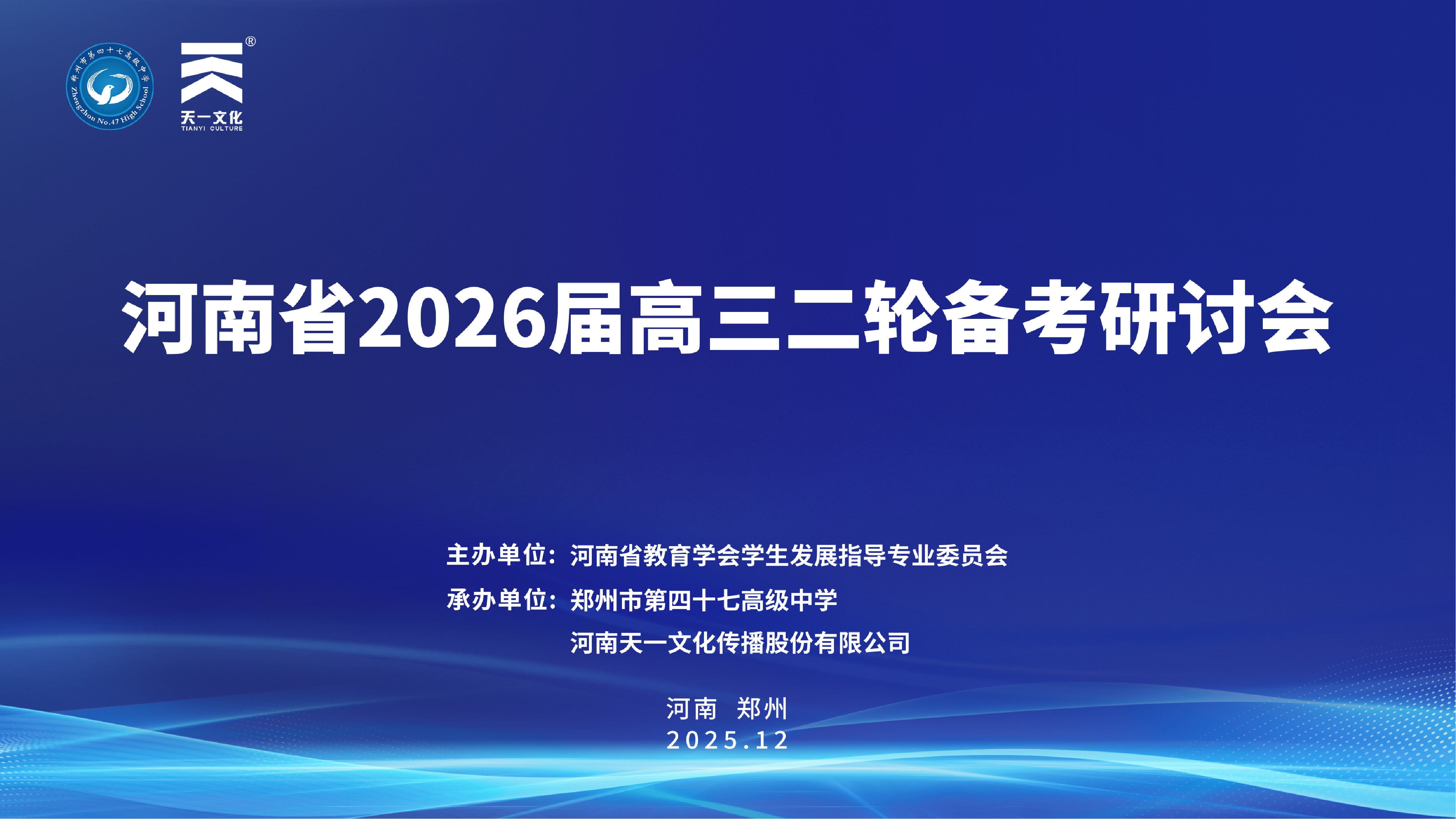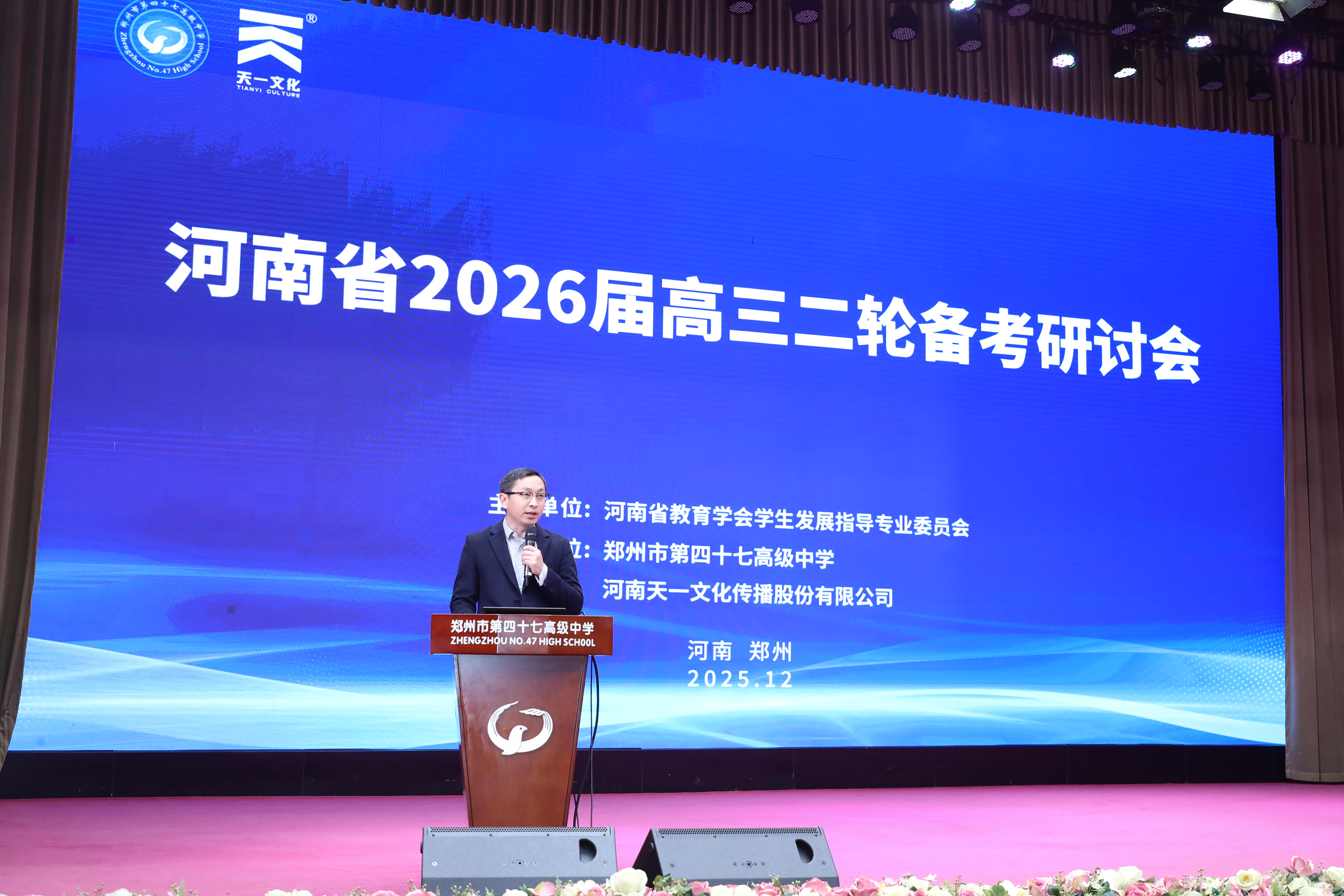 2025年12月20日,由河南省教育学会学生发展指导专业委员会主办,郑州市第四十七高级中学与河南天一文化传播股份有限公司联合承办的“河南省2026届高三二轮备考研讨会”在郑州市第四十七高级中学顺利举办。来自河南省18地市120所高中的千余位学校领导、骨干教师齐聚一堂,共探新高考背景下二轮复习提质增效之路,这场高规格、高实效的教研盛会为我省高三备考工作注入强劲动力。