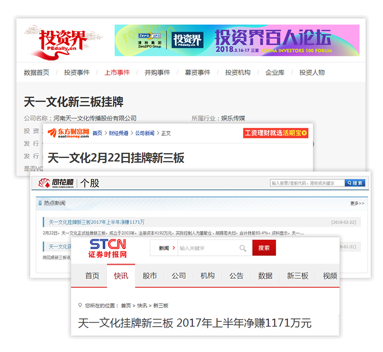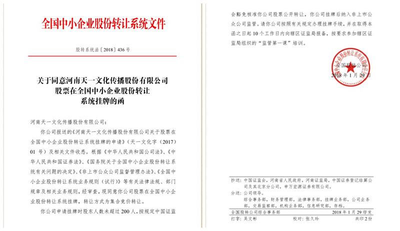 2018年2月22日,在全国人民欢度新春佳节之际,河南天一文化传播股份有限公司喜获捷报,在全国中小企业股份转让系统即“新三板”正式挂牌上市,成功登陆资本市场!