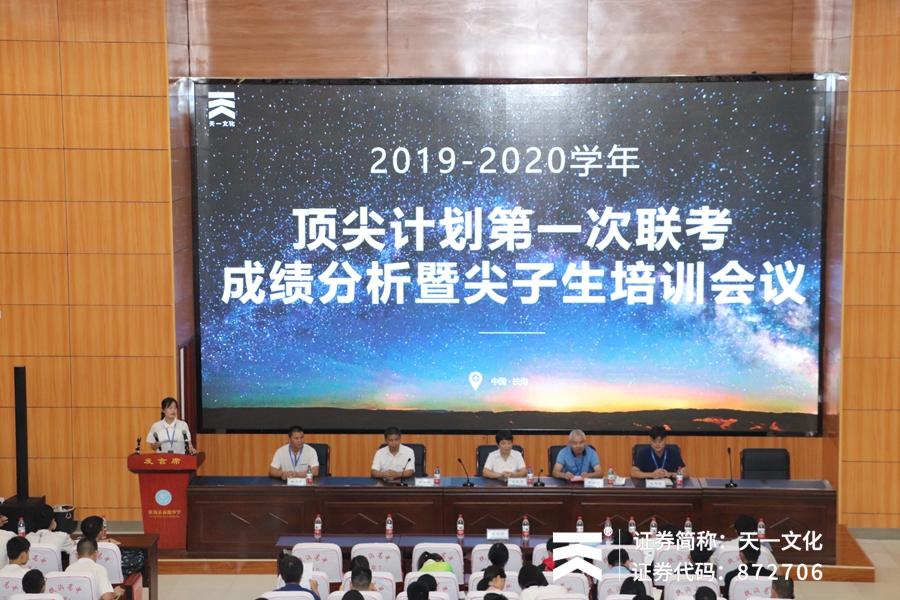 2019年8月25日,在天一文化“顶尖计划”第一次联考结束及成绩发布之后,公司在扶沟县高级中学召开了“顶尖计划第一次联考成绩分析暨尖子生培训会议”并取得圆满成功。会议当天,来自省内30多所顶尖高校的400余名领导老师、同学参会,此次会议得到了扶沟县高级中学的大力支持,扶沟县高级中学冯凤云校长、万书桓校长共同出席了本次会议并在会上作重要讲话。