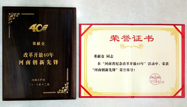 论坛发布了“纪念改革开放40年——河南卓越贡献企业家、创新先锋”名单并举行了颁奖仪式。天一文化董事长兼总经理董献仓先生荣获河南改革开放40年——河南创新先锋荣誉,督导企划部经理张保林先生前往参会并领取奖牌及证书。