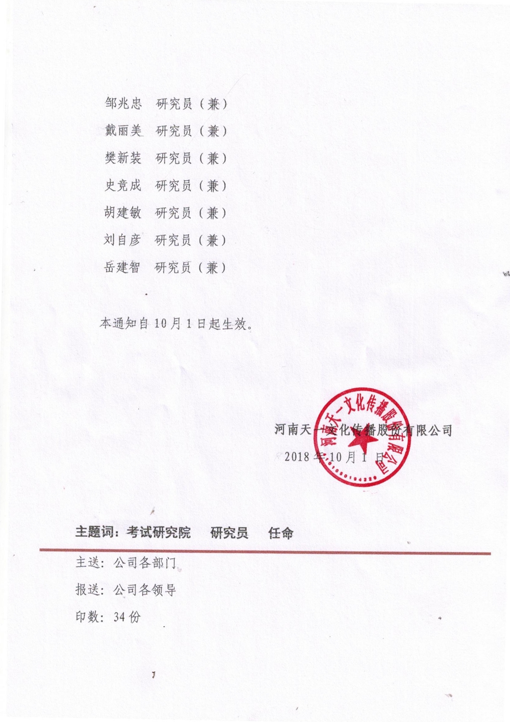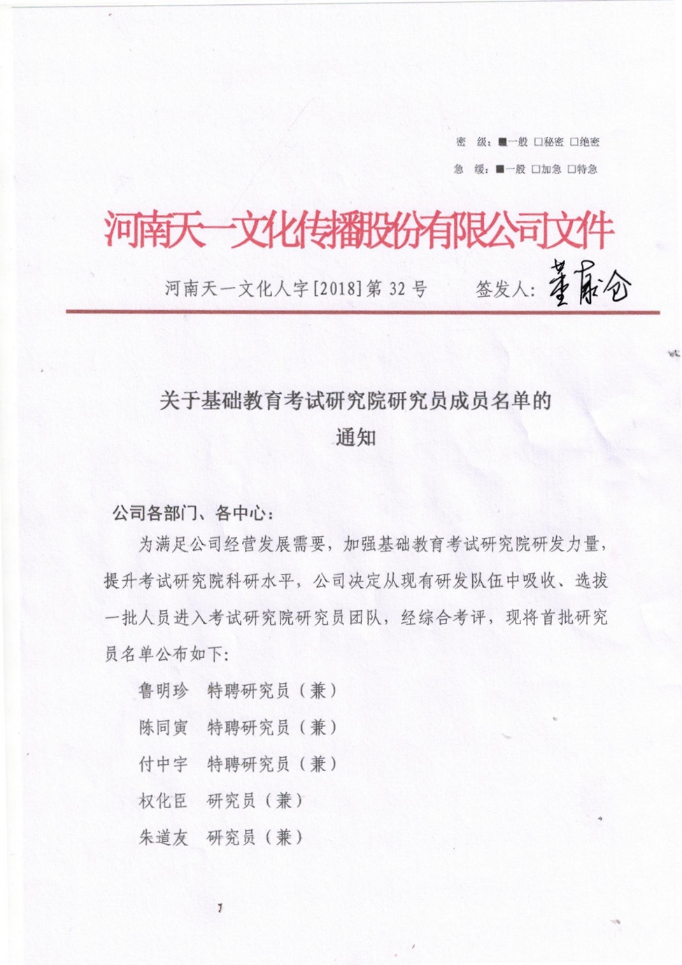 日前,河南天一文化传播股份有限公司对考试研究院研究员成员进行了补充优化,