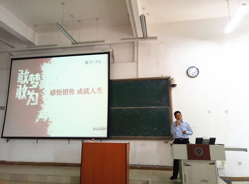 接着,天一文化督导企划部王羽就行业发展现状和公司基本情况向同学们进行了详细介绍。天一文化副总经理宋耕田为同学们做了“感悟销售,成就人生”的主题报告,分享了自己多年来从事营销事业的感悟和独到的营销理念,营销不是简单的销售商品,而是一门富有创造性和艺术性的科学,宋总的分享使同学们感悟了销售的独特魅力。在宋总的精彩讲话后,人力行政部周悦扬就营销协会的具体情况进行了介绍,多样的培养方式和科学高效的课程设置吸引了众多渴望成长的优秀学生。其后,在天一工作的民生学院优秀校友李飒、吕新龙和学弟学妹们分享了自己在天一的成长经历和优秀经验。