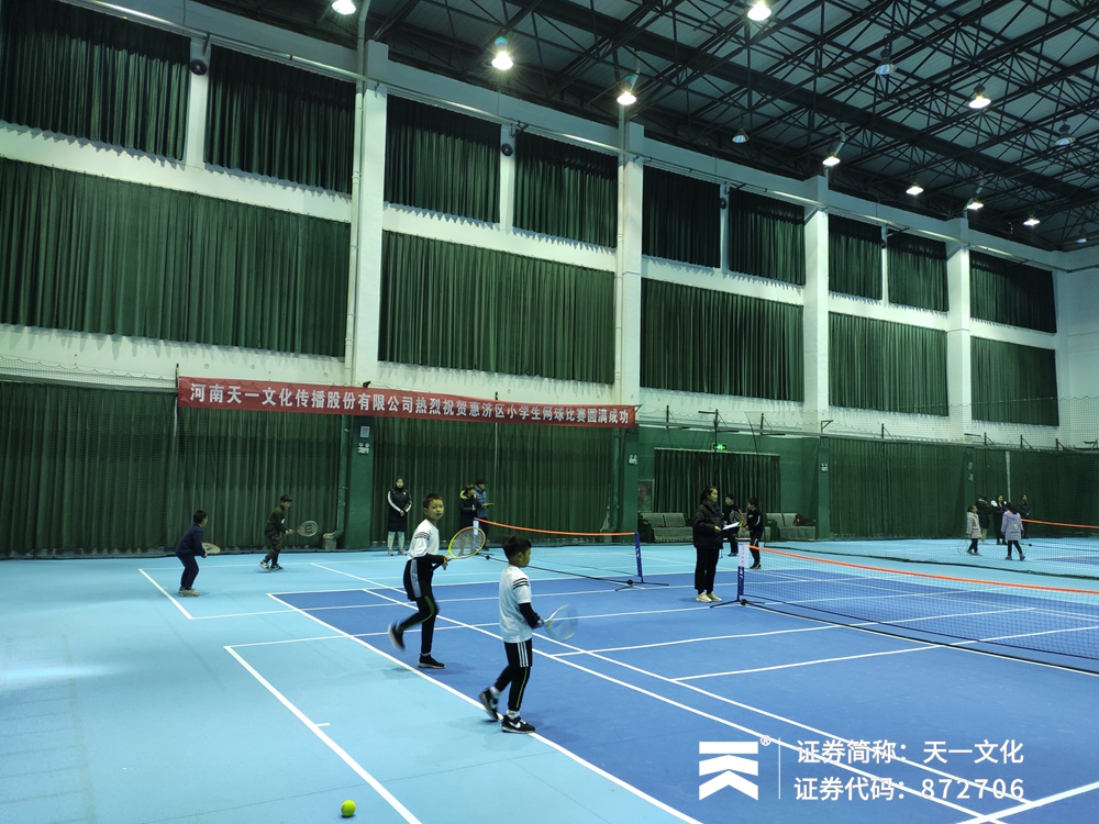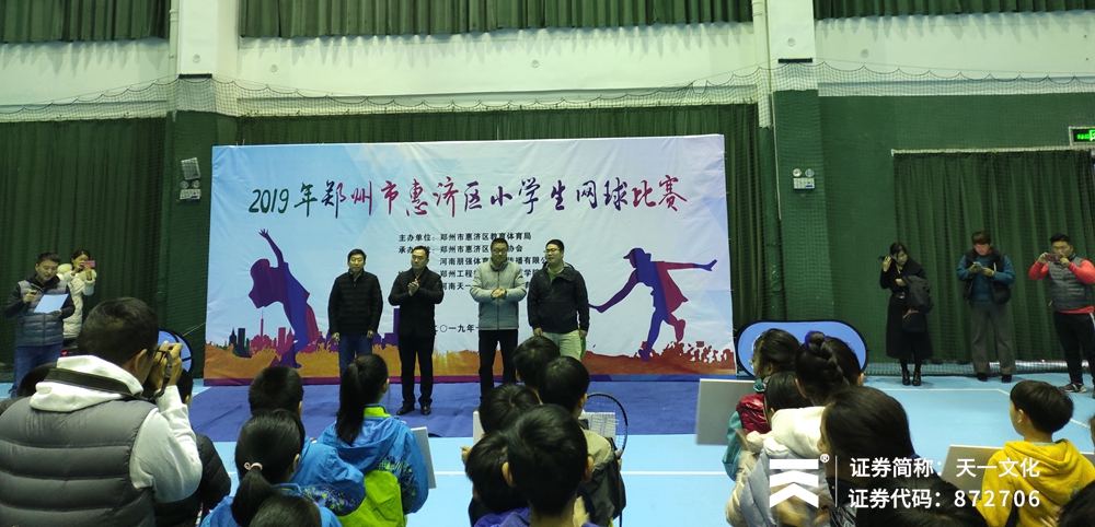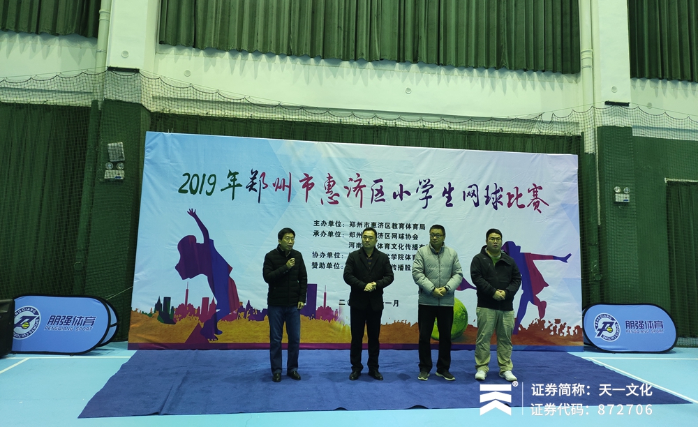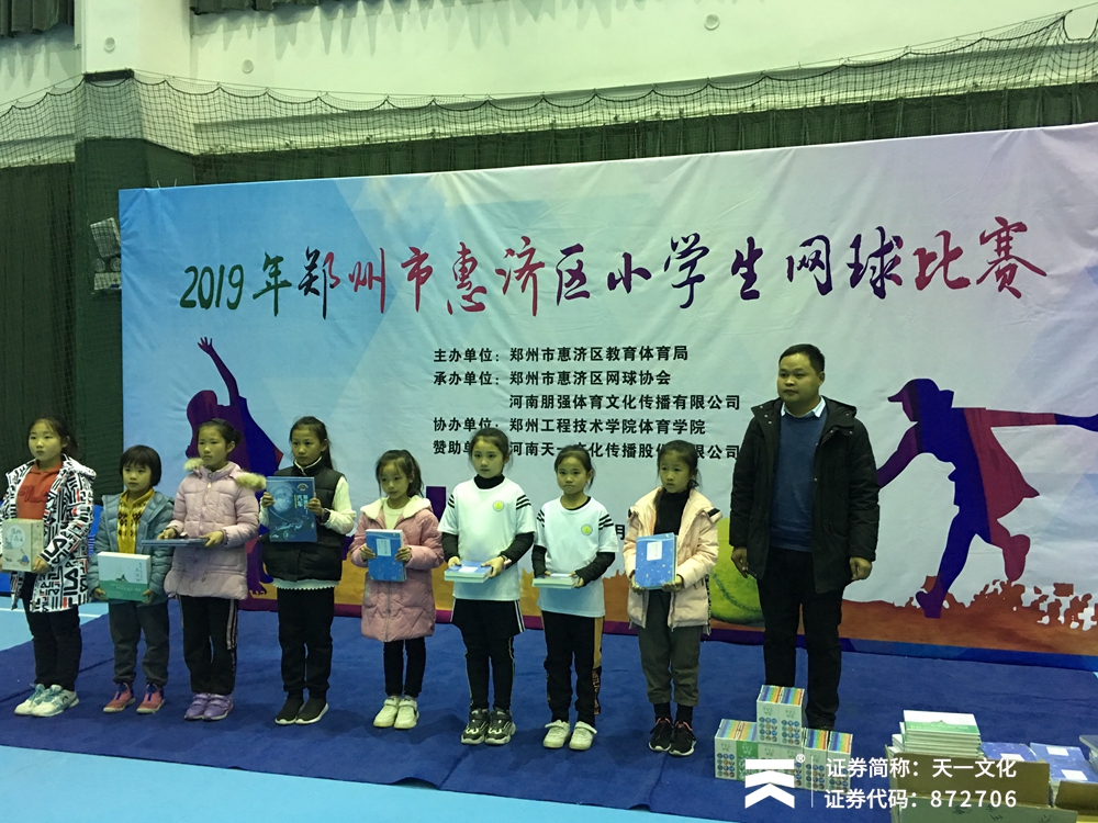 2019年11月30日,由郑州市惠济区教育体育局主办,郑州市惠济区网球协会、河南朋强体育文化传播有限公司承办的2019年郑州市惠济区小学生网球比赛在郑州工程技术学院体育学院成功举办。河南天一文化传播股份有限公司倾情赞助了本次比赛,并为获奖的选手们准备了精美的图书奖品。