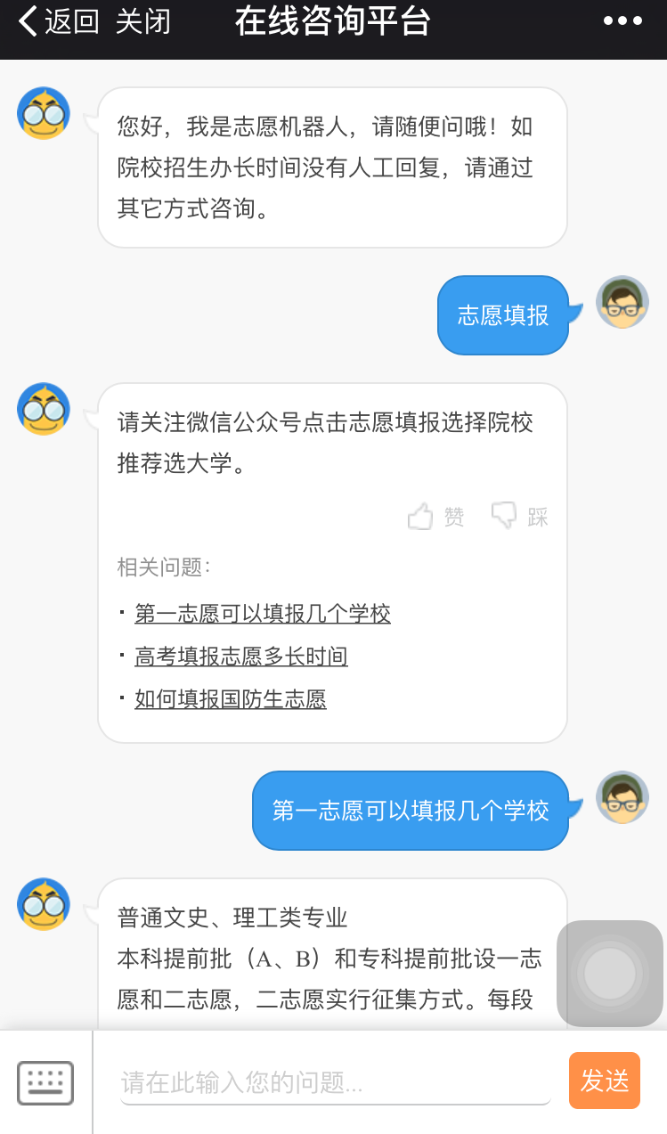 打小,老师、家长就叮嘱我们“不懂就问,不懂就问”。高考志愿填报在即,不是我问的你都知道,不是我想知道的你都能说清楚,也不是我问的时候恰好你在。人工与智能,两条腿走路更能让我们眼观四路,耳听八方。天一大联考志愿填报系统设置“高考咨询”栏目,志愿机器人友情为您解难答疑。