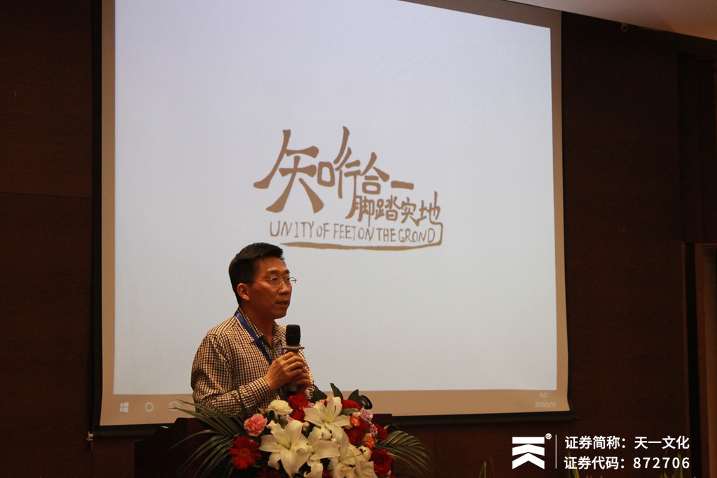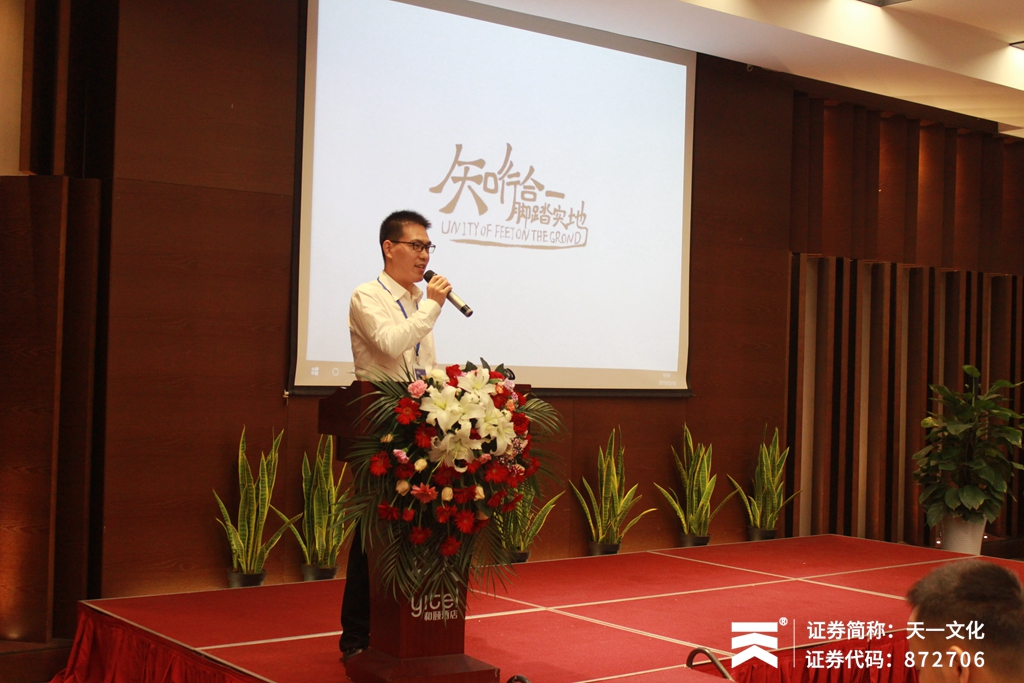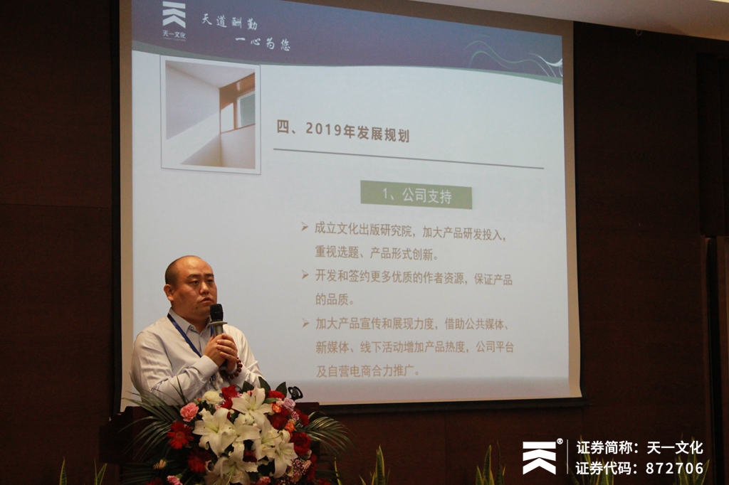 接着,在文化出版营销部经理李强先生向大家介绍了现有文化出版的产品体系、现有产品近三年的销售状况、存在的问题及改进办法,解读了2019年的发展规划和市场政策等内容。李经理表示,天一在文化出版这个版块还是一个学生,希望能有更多的机会向行业的各位老师请教学习。在后续的发展中,天一将为客户提供更好的服务,并提高自身实力,共同发展,共赢未来。