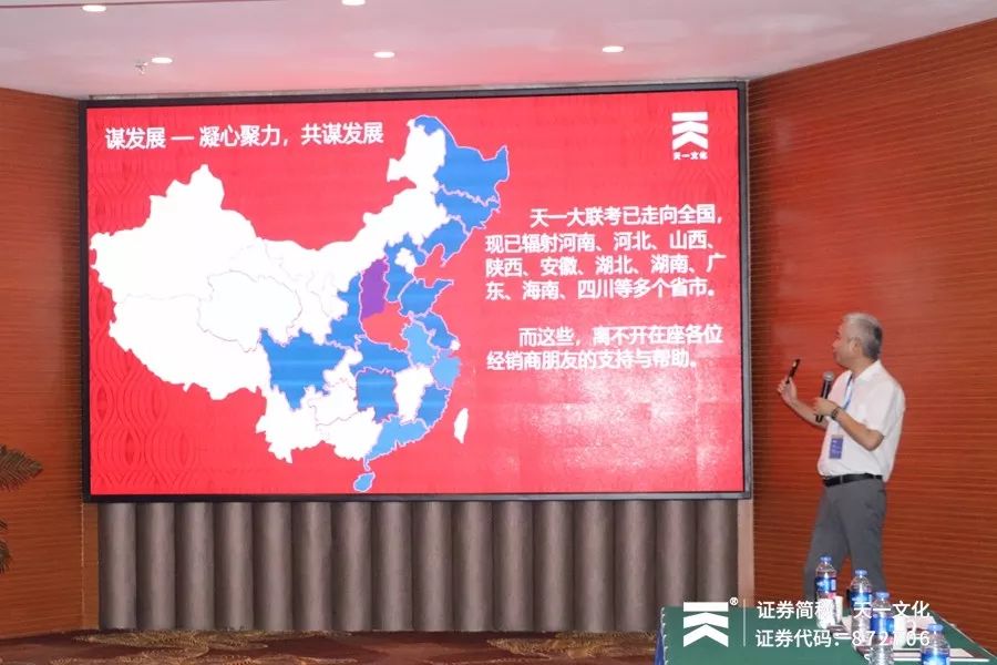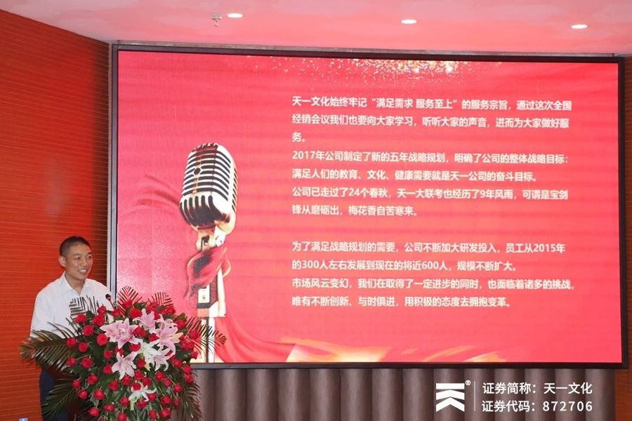 会议于下午14:00正式开始,会议第一项,河南天一文化传播股份有限公司董事长兼总经理董献仓先生致会议欢迎辞。董总首先对远道而来的各位经销商伙伴表示欢迎,2019年,公司进一步优化了管理团队、完善了组织架构,天一文化将始终牢记“满足需求 服务至上”的服务宗旨。通过这次全国经销会议,我们也要向各位伙伴学习,听听大家的声音,进而更好地为大家做好服务。