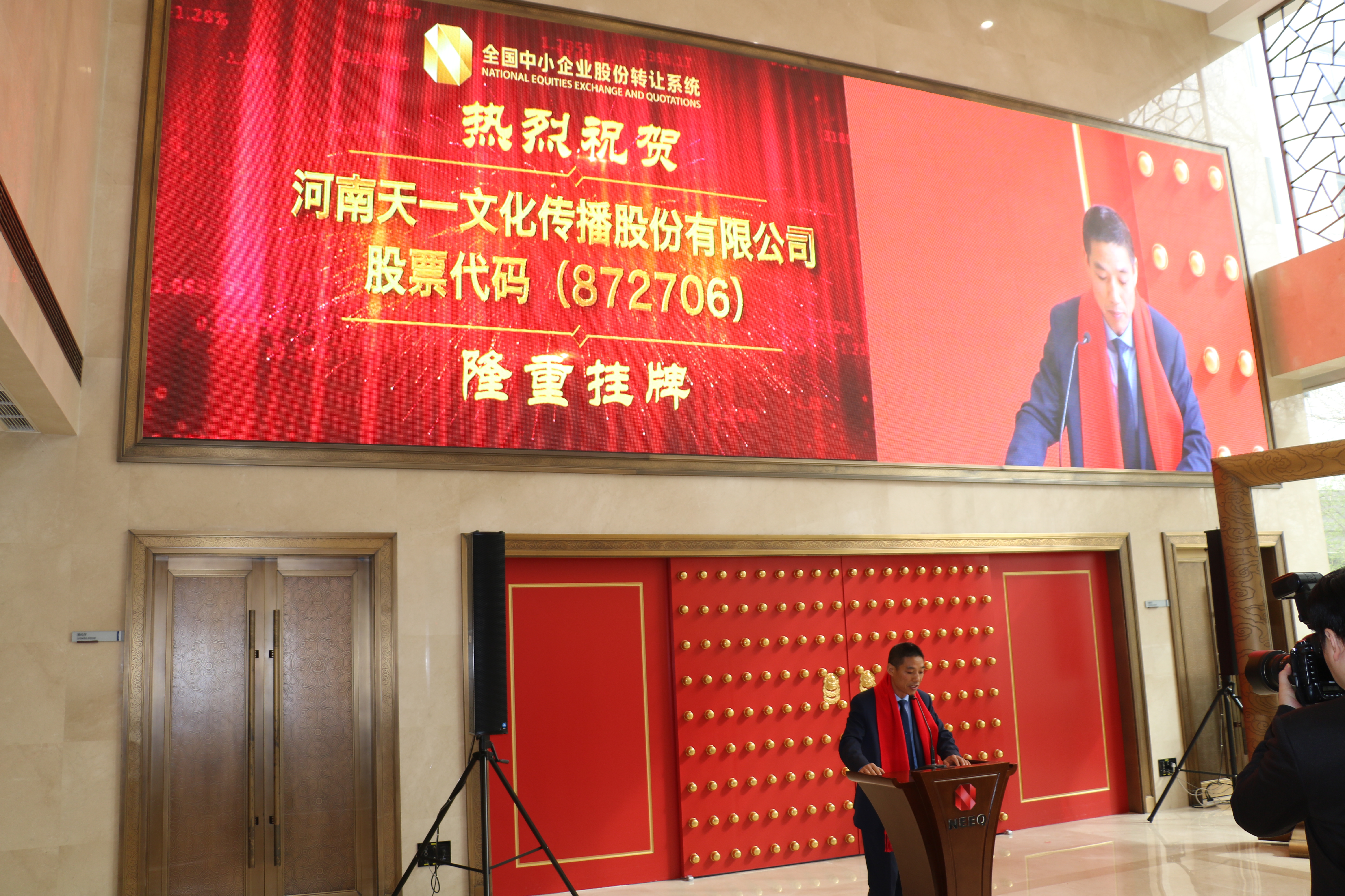 2018年3月28日,河南天一文化传播股份有限公司(简称:天一文化,证券代码:872706)新三板挂牌仪式在北京全国中小企业股份转让系统中心隆重举行!天一文化董事长董献仓先生携公司高管团队,董事会、监事会代表,券商代表等一行十人出席了此次挂牌仪式,共同见证天一文化这一里程碑式的重要时刻!