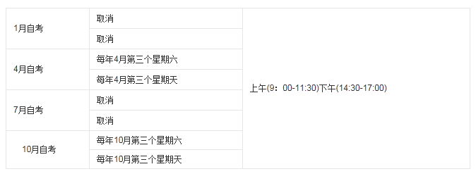 全国自学考试时间一般如下,各省时间可能微调,建议考生主动咨询当地自招办。