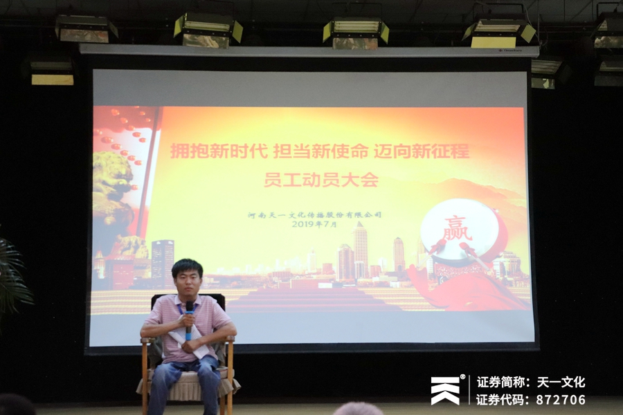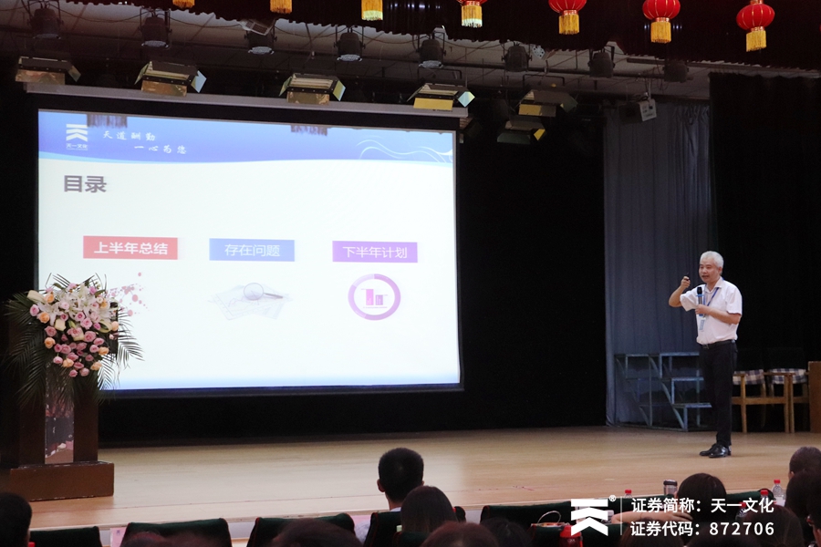 最后,董总对本次会议作总结讲话,董总首先肯定了近年来各部门的工作成果,并感谢各位同事的辛苦付出。董总同时指出,市场要求不断变化,企业也要不断成长,在接下来的工作中,大家仍要以正直、诚信、务实、创新的价值观为指引,保持做人做事、创新进步的企业精神,适应公司和社会的新形势与新要求,持续为社会提供优秀的智力文化产品和服务,促进人类的自身完善和成长。下半年天一文化仍将明确目标、团结一心,以更雄厚的实力步入新征程,向用户和社会递交更满意的答卷!