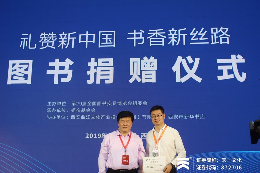 本次图书捐赠活动由韬奋基金会承办,早在6月就已启动。会前,在各方积极动员努力下,共有全国21个展团的180家出版发行单位,向陕西省公共图书馆、农家书屋、职工书屋、学校图书馆等公益性文化服务机构捐赠了共计77万余册、价值1949万元码洋的图书和阅读体验卡。天一文化在接到主办方的倡议后,积极响应号召,主动承担社会责任,共爱心捐赠三万余码洋的文化出版书籍,为全民文化阅读事业做出了自己的贡献。