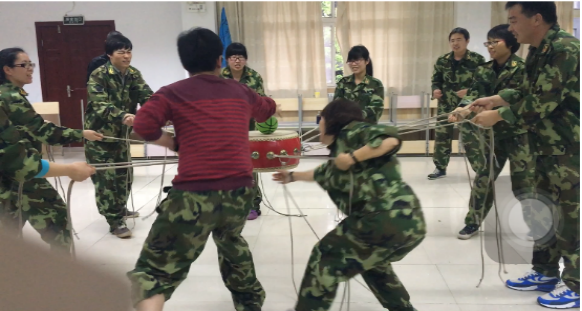 “鼓动人生”是一个培养团队凝聚力的项目。项目要求团队的每位成员都参加,每人用手拉起鼓上的一根或两根绳子,以便将鼓支撑起来。然后,将一个球放在鼓面上,所有人一齐拉动手中的绳子使球弹离鼓面20cm以上。在最初练习的时候,球不是在鼓面上弹不起来就是在鼓面上弹一下就落回地面。可是大家并没有气馁,而是在认真分析原因之后,将改进方案在下次的练习中进行有效地实施。