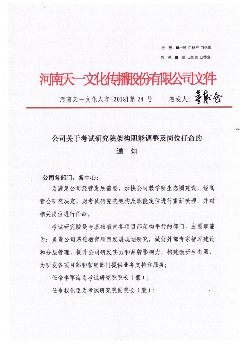 ,河南天一文化传播股份有限公司特对考试研究院架构和职能进行调整与任命。通过对考试研究院的优化整合,公司将持续提高产品研发能力